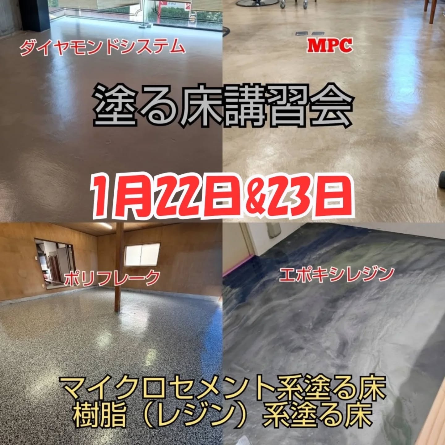 ダイヤモンドシステム、MPC、エポキシレジン、ポリフレーク。注目度の高い4種類の塗床材を同時に学べます。